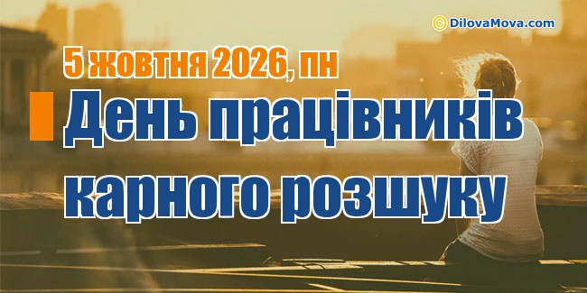 Центральне управління карного розшуку - Центророзшук, було організовано в жовтні 1918 року. З того часу при місцевих органах міліції почали діяти спеціальні підрозділи «для охорони порядку шляхом негласного розслідування злочинів кримінальн... також 5 жовтня відзначається ![]() ![]() ![]() ![]() найближчі 5 подій Дати та дні, події та календарні зустрічі професійних свят10 жовтня, субота - Всесвітній день хоспісів та паліативної допомоги, День працівників стандартизації та метрології України