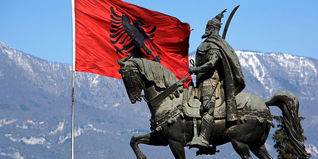 Прапор Албанії на фоні пам’ятника Скандербегу